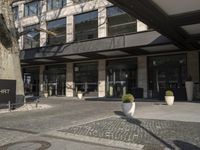 A modern mixed-use building in Berlin, Germany. The impressive architecture stands tall against the city skyline. The bustling urban streets below are lined with shops, restaurants, and hotels, creating a vibrant city life.