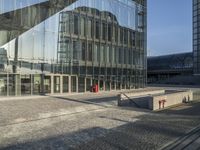 This stock photo showcases a modern architecture building in Berlin, Germany. The building features mirrored glass windows on the side and is situated in a bustling city. The surrounding area is adorned with cobble stone streets, giving it a charming and historic feel. The mixed-use building serves as a corporate headquarters and offers open spaces and a plaza for people to enjoy. With its sleek facade and clean lines, it perfectly exemplifies urban design. The glass walls reflect the clear sky, adding to the overall aesthetic of the city. This image captures the essence of city life and the vibrant business district in Berlin, Europe.
