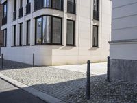 This stock photo captures the modern architecture and vibrant city life in Berlin, Germany. The image showcases a residential building located in a bustling neighborhood. The sleek design of the building contrasts beautifully with the surrounding trees and cobblestone road. The urban design of the area is highlighted by the line of trees, entryway, and office buildings in the background. The photo captures the essence of European urban living in Berlin's lively business district.