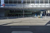 This is an image of a modern architecture in downtown Toronto, Canada. The city streets are lined with asphalt roads, concrete sidewalks, and steel structures. The buildings cast hard shadows as the sun shines down on the metropolitan area. Pedestrians can be seen walking along the sidewalks, and signage indicates the way to various office buildings and public spaces. This photo captures the urban design and engineering of Toronto, showcasing the bustling city life in the business district. The concrete streets run parallel to each other, creating a well-defined thoroughfare.