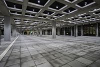 This is an image of a courtyard inside a building, featuring columns and a concrete structure. The flooring is made of composite material and the ceiling is adorned with lights. The symmetrical design creates a spacious and elegant atmosphere. Glass elements are also present, adding a modern touch to the overall aesthetic. This photo showcases the interior of the building, highlighting the architectural features and the use of light and space.