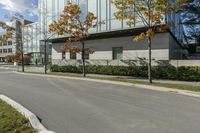 A red stop sign is in front of a modern building in Toronto. The building has a concrete curb with grass and trees around it. The city streets are made of asphalt. This photo represents the urban design and infrastructure of a residential area in Toronto, Canada.