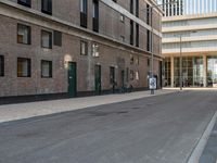 This stock photo shows a modern architecture building with a brick facade in Holland. Located in a residential area, this property stands out with its contemporary design. The paved sidewalk with three parked bikes and a building in the background create a dynamic urban scene. The beautiful combination of wood, brick, and window fixtures adds to the charm of this European city. This image captures the essence of city life and urban design in Holland.
