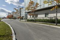 This stock photo showcases the modern architecture of a residential area in Toronto, Canada. The image features a paved road with some buildings on a sunny day. There are lush trees in the foreground, adding a touch of nature to the urban setting. The infrastructure and road surface are well-maintained, highlighting the attention to detail in the city's urban design. The clear sky enhances the overall beauty of this public space. The photograph captures the dynamic city life and the vibrant atmosphere of Toronto.