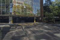 This is an image of a modern condominium building in Toronto, Ontario, Canada. The architecture features a glass facade with windows reflecting sunlight. The building is surrounded by a clear sky and lush vegetation. In front of the building, there is a well-designed urban space with asphalt roads, parking areas, and crosswalks. The image captures the vibrant urban design of Toronto, with the building casting a hard shadow on the road surface. This photo showcases the dynamic and vibrant cityscape of Toronto's architectural landscape.