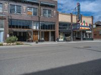 A classic architecture storefront in a rural town in Utah. The hard shadow of the building falls diagonally across the asphalt road. A cloudy day adds to the urban atmosphere.