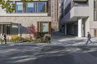 A view of Toronto city showcasing modern architecture. People walk around an empty courtyard, surrounded by large buildings on both sides of a street. The residential area is filled with beautiful houses and condominiums. The road surface and asphalt create a smooth path as cars and bicycles move through the urban design. The city life bustles with activity in this vibrant neighborhood. The clear autumn sky adds to the picturesque scene, with vegetation and flowers adding color and life to the public space. Detailed windows and entryways of homes and buildings can be seen. The hard shadows and profiles of tire wheels on the curb add depth to the image.