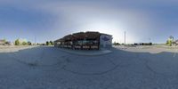 An empty parking lot in Toronto, Canada. Buildings of mixed-use architecture surround the lot. The clear sky and sunlight highlight the concrete and asphalt surfaces. A food store is prominently featured in the shot.
