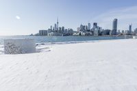 A breathtaking view of the modern architecture in Toronto, Canada. The cityscape is dominated by impressive skyscrapers that rise above the city. The clear sky and contrails add to the beauty of the scene. The coastal area features a stunning harbor with a pier and jetty. The road along the shoreline offers access to the tourist attractions and human settlements. In the distance, the calm lake surface contrasts with the frozen landscape of the winter season. It's a picture-perfect day to explore this metropolitan area and enjoy the urban waterfront.