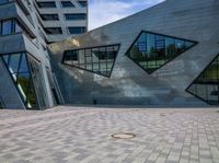 This stock photo showcases a modern architectural structure located in a vibrant urban city. The image features an open courtyard with multiple windows and a circular hole in the ground near buildings with striking geometric shapes. The futuristic architecture seamlessly blends into the cityscape, making it an excellent representation of contemporary urban design. The cloud-filled sky and bright daylight add to the overall aesthetics of the scene. The paver surface and various structural elements highlight the careful attention to detail in this archviz masterpiece.