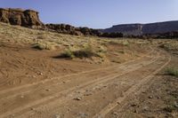 This stock photo showcases a brown dirt road leading towards an arid plateau in Canyonlands, Utah. In the background, majestic mountains rise against a clear sky, creating a stunning landscape. The geological phenomenon of erosion is evident in the rock formations, showcasing the beautiful red rock walls. Small rocks and gravel can be seen scattered on the surface of the road, adding to the rugged nature of the scene. This image captures the essence of the Lockhart Road in the Needles district, offering a glimpse into the remarkable beauty of Utah's scenic wonders.