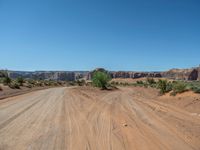 A straight road cutting through the open space of the Arizona landscape in Monument Valley, USA. A clear sky above showcases the natural beauty of the off-road track. Perfect day for exploring dirt and gravel paths.