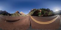 Two roads in Arizona, one with a yellow stripe and the other with red, wind through the scenic landscape of mountains. Clear skies and lush greenery provide a picturesque backdrop. A road trip through nature's wonders.