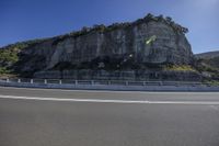A coastal road with a clear sky and ocean view. The road surface is smooth asphalt, bordered by Armco barriers. The landscape features sloping terrain and recreational areas near the water.