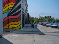 A vibrant graffiti wall in Salt Lake City's art district. The concrete street offers a canvas for street art. Straight down the road, storefronts and shops add to the urban vibe. Hard shadows create depth on a sunny day.