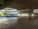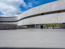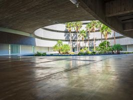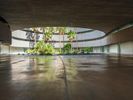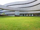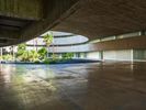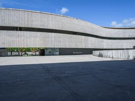 An artistic photograph showcasing the architectural design of a building in Tenerife, Canary Islands. The curved walls and interior design create a unique visual experience. The building stands out in the metropolitan area, surrounded by green spaces and a symmetrical landscape.