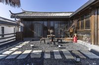 A small courtyard in an Asian-style villa in Lijiang, China. Classic architecture blends with urban elements. Gravel surface creates an open space. Clear sky highlights the charm of this tranquil backyard oasis.