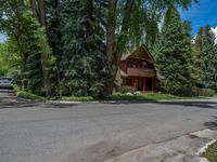 Asphalt road lined with aspen trees in a Colorado suburb. Daytime scene with greenery and residential houses under cloudy skies. A typical suburban landscape in the USA.
