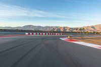 A race track in the USA at dawn, with asphalt glistening under the first rays of sunlight. Clouds overhead create a dramatic backdrop for the curved road. The perfect setting for exhilarating racing.