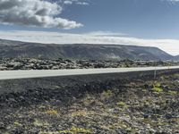 A motorcycle parked on the side of an asphalt road in Iceland with a rugged landscape and clear skies. The road surface contrasts with the large rocky field, showcasing the natural beauty of this European island.