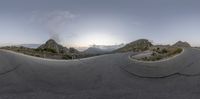 Aerial view of an asphalt road in Majorca, Spain, winding gently through the Balearic Islands. The curve of the road, Armco barrier, and dawn sunlight create a picturesque European landscape.