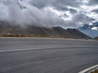 an asphalt road next to a mountain in the clouds with a motorcycle and mountain range
