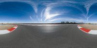 the wide angle photo of a panoramic picture taken of an asphalt track with a house in the background