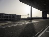 This is a black-and-white image of an empty city street. The sunlight shines down through the buildings, creating a dramatic effect. In the foreground, the road surface, covered in asphalt, leads to a public space with a crane at the top of a building. The image captures the style and atmosphere of a quiet city thoroughfare. The contrasting tones and empty spaces give a sense of solitude and tranquility. This photo represents the beauty and simplicity of urban landscapes.