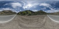 an upside down shot of the intersection of a rural road and mountain range as seen from a fish eye lens