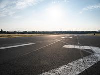 A view of an asphalt road in Berlin, Germany. The road surface stretches through an open space with grass plains. Sunlight illuminates the city skyline and the clear sky. A vibrant cityscape capturing the essence of urban life in Europe.