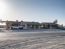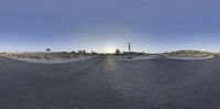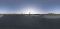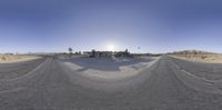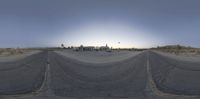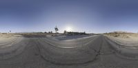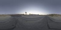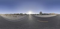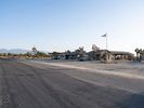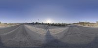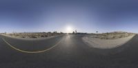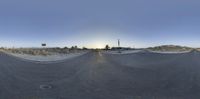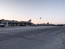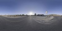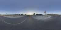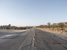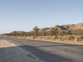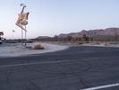 A suburban road stretches straight down the asphalt in Los Angeles, California. The clear sky of dawn highlights the desert landscape, with motels lining roadside. A quintessential view of suburban California.