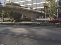 A view of a modern office building in downtown Los Angeles. The building stands tall against the clear blue sky, surrounded by trees and urban design. The busy streets below showcase the vibrant business district of the city.