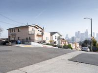 A suburban Los Angeles street, showcasing lined asphalt roads and residential areas under a pristine clear sky. The urban landscape of California's metropolis offers a tranquil cityscape.