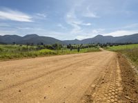A picturesque landscape in the Bega Valley, New South Wales. Lush green grass and vegetation contrast with the sandy road and mountain backdrop. Clear sky with contrails adds to the natural beauty. Off-road tracks offer a glimpse into Australia's agricultural heartland.