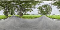 A picturesque rural road in New South Wales, Australia, winding through the lush green fields of Bega Valley. Two trees frame the straight road, creating a shaded path under the sunlight. Explore the scenic landscape of the Sapphire Coast on this peaceful road.