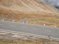 a lone skateboarder walks along an empty country road on a steep hill with mountains in the background
