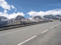 This is an image of a road winding through the picturesque landscape of the Austrian mountains in Europe. The asphalt road is surrounded by lush green highlands and slopes, with a clear sky and fluffy white clouds overhead. Guard rails and Armco barriers are visible along the road surface, ensuring safety for travelers. This photo represents the natural environment and the beauty of the Austrian countryside. It captures a serene moment of a day in the outdoors, where nature and mode of transport converge.