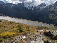 A group of motorcycles drive down an asphalt road, surrounded by snowy mountains and a cloudy sky in Austria. The picturesque landscape showcases the beautiful terrain and nature of Europe.