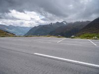 Gloomy day in the highlands of Austria. Grey skies cast a gloom over the landscape, highlighting the vast mountain range and open spaces. The asphalt road and parking lot blend into the gloomy surroundings.