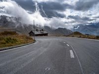 the road winds in for storm approaching the clouds and fog on top of the mountain