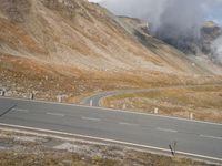 a motorcycle on a winding road with mountains in the background, and a plume of smoke behind the road