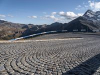 This is an image of a curved street in Austria, Europe. The road winds through the mountainous landscape, providing a perspective for the curve. The clear sky above contrasts with the rural scenery, showcasing the natural beauty of the area. The road surface is made of asphalt and cobblestone, and is lined with guard rails and Armco barriers for safety. This photo captures the combination of architecture and nature, as the road blends seamlessly into the surrounding environment. It represents the charm and allure of the Austrian countryside.