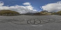 A picturesque landscape in Austria with two majestic mountains. The asphalt road, lined with black circles, leads to an open space with a bench offering a breathtaking view. Clear skies add to the serene beauty of this European scene.