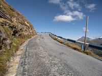 A scenic landscape in Austria, featuring a winding road along the coastal slope. The clear sky frames the mountains and horizon. The road surface, guard rail, and Armco barrier protect travelers on this picturesque European thoroughfare.