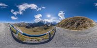 A stunning aerial view of an open space in Austria, with a winding road curving through the picturesque mountain landscape. The clear sky and sunshine create a bright and sunny day. The panoramic fisheye perspective captures the beauty of the European landscape.