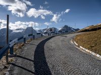 A picturesque landscape in Austria, featuring a winding road that cuts through the highlands. The clear sky and electric horizon provide a stunning backdrop for the low-lying architecture. Nature's beauty is showcased with mountains, trees, and cobblestone tracks.