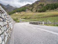 This image captures the beauty of the Austrian landscape. A winding road, lined with stone fences, leads down to a mountain pass. The asphalt road stands out against the gloomy and grey sky, creating a moody atmosphere. The wetness of the road reflects recent rainfall, adding to the natural scenery. The photo showcases the peaceful and serene nature found in Europe. It is a perfect representation of a cloudy day in Austria.