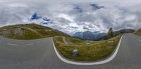 a 360 - view is shown from a car's perspective mirror at the intersection of a mountain and a street