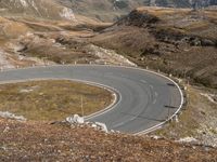 An aerial view of an elevated mountain road in Austria. The switchback curve winds through the highland landscape, surrounded by breathtaking mountain ranges and open fields. Two motorcycles parked alongside the road add to the natural beauty of this European thoroughfare.