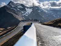 A picturesque landscape in Austria, showcasing a winding mountain road. Snow-covered peaks loom in the distance as a cyclist rides along the asphalt. Cars parked on the side add to the serene day scene.